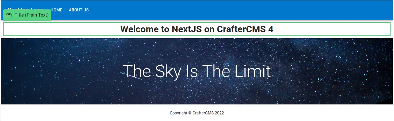 While the green pencil is active, click on components such as the text “Welcome to NextJS on CrafterCMS “, you should see a green box appears showing that the text is editable. Click on it and change the text to “Welcome to NextJS on CrafterCMS 4“.