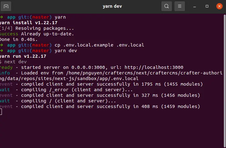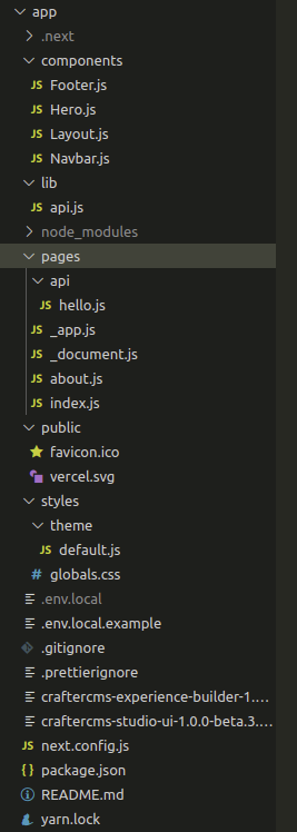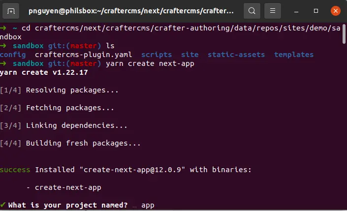 - In the CrafterCMS site sandbox directory, you'll find a directory called app, which is the Next.JS app. Visit that directory on your terminal and run `yarn`