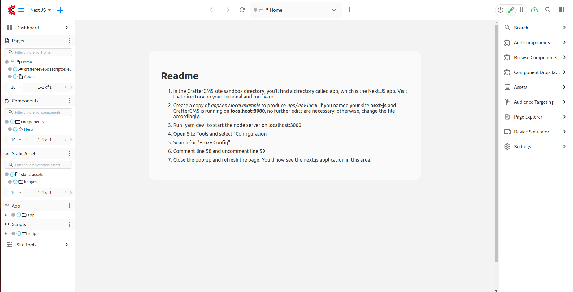 - Create a copy of app/.env.local.example to produce app/.env.local. If you named your site next-js and CrafterCMS is running on localhost:8080, no further edits are necessary; otherwise, change the file accordingly.