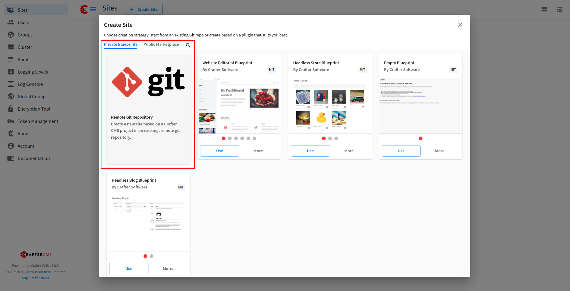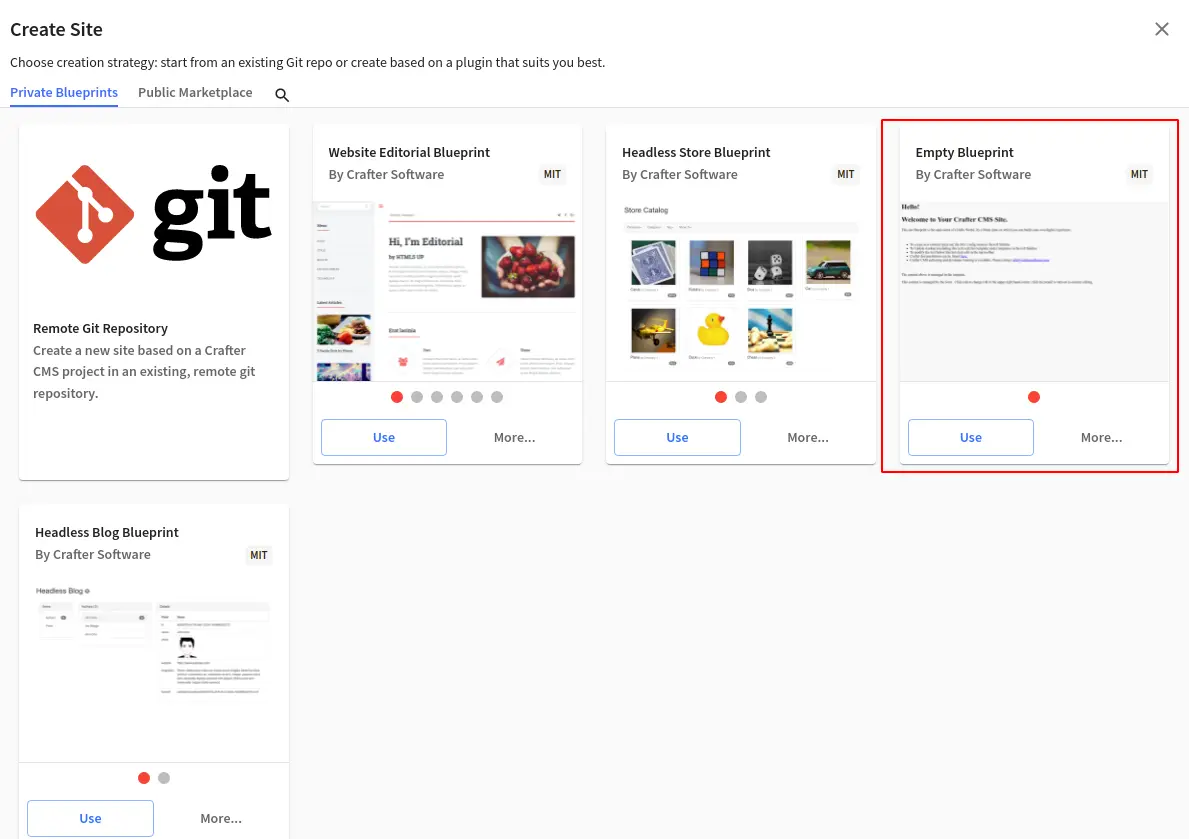 Go back to the Global Menu, Select Create Site with an Empty blueprint.