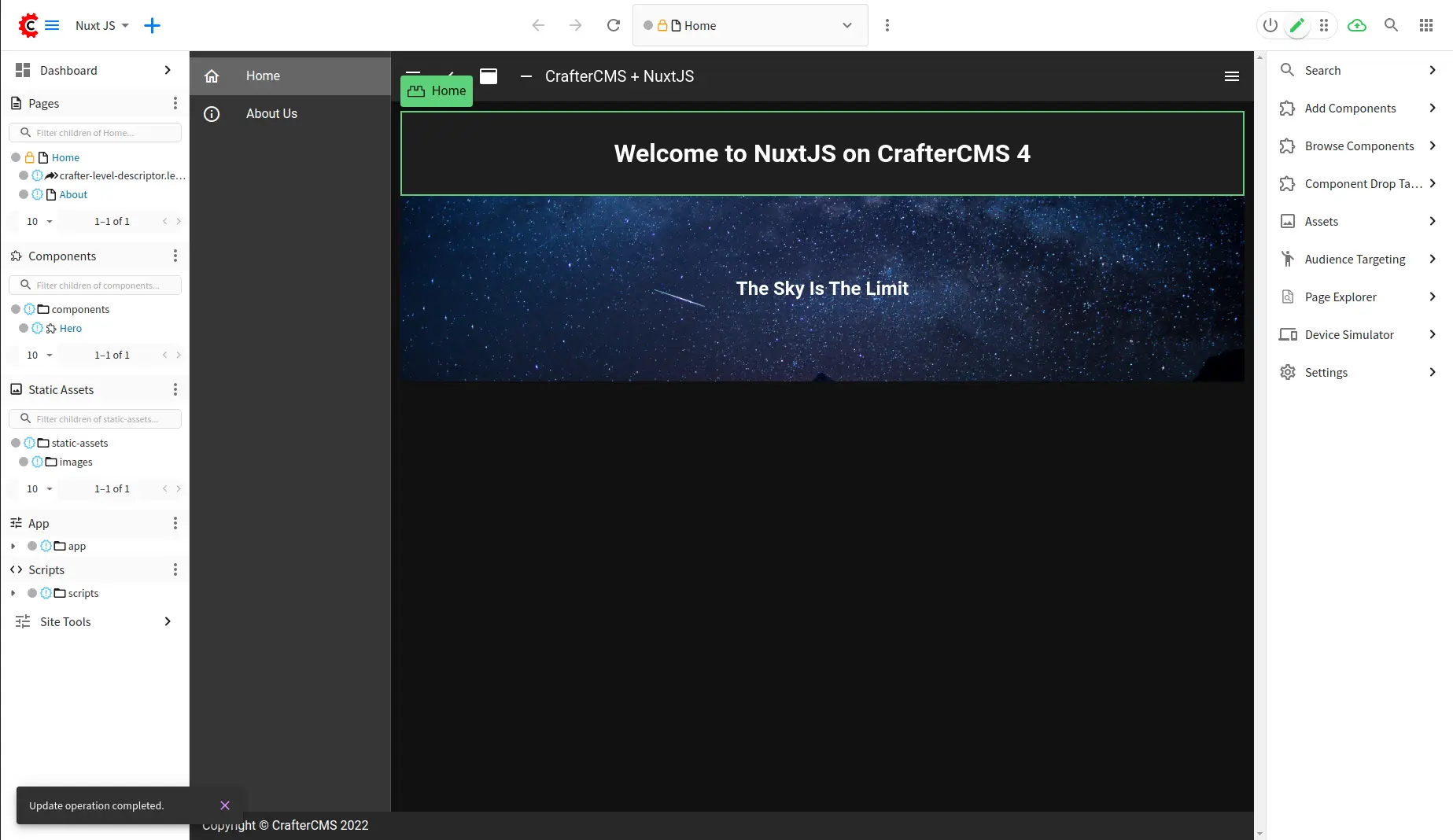 CrafterCMS provides a full-featured editing toolset for content authors combined with comprehensive headless CMS capabilities for developers, and this combination is quite unique. In this tutorial, you will learn how to create a content-rich, NuxtJS-based web application with in-context editing and other easy to use content authoring capabilities.