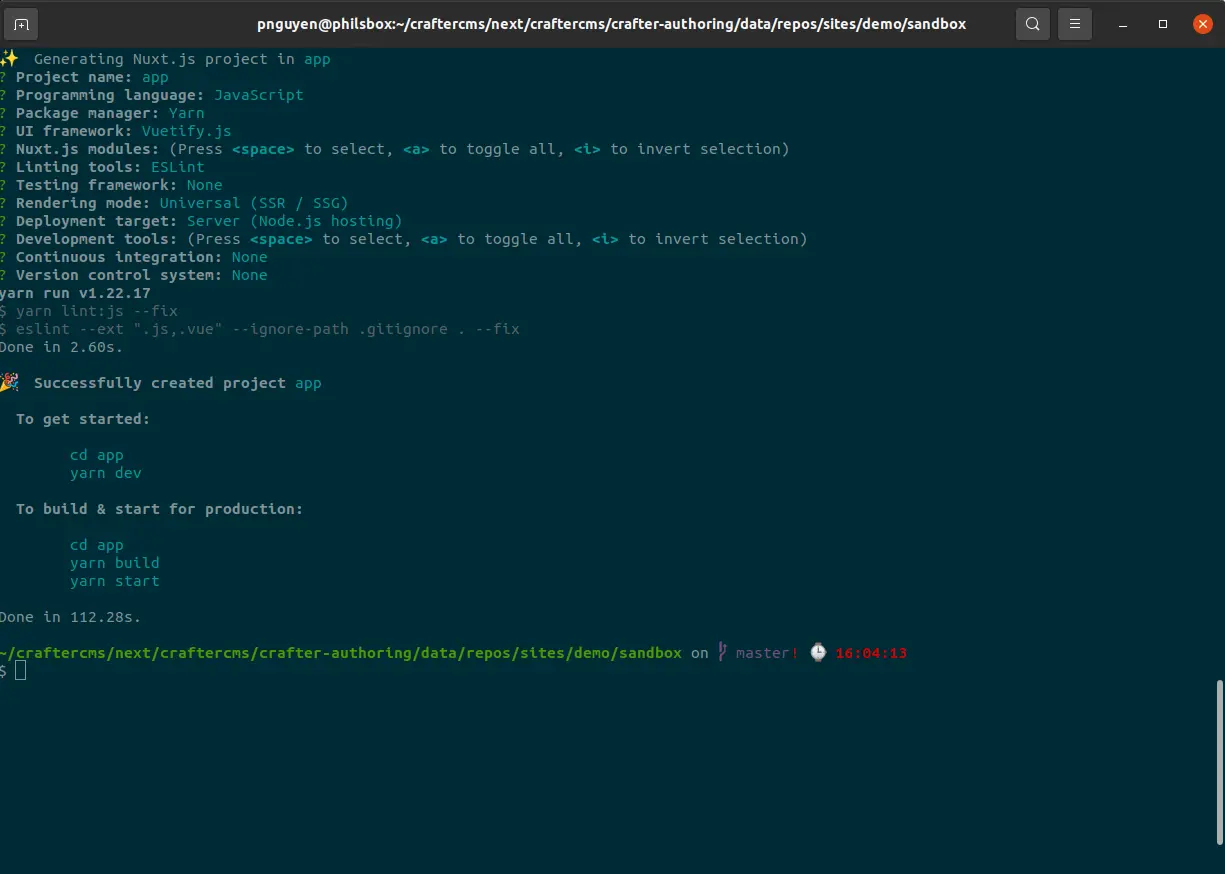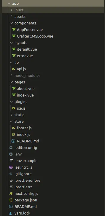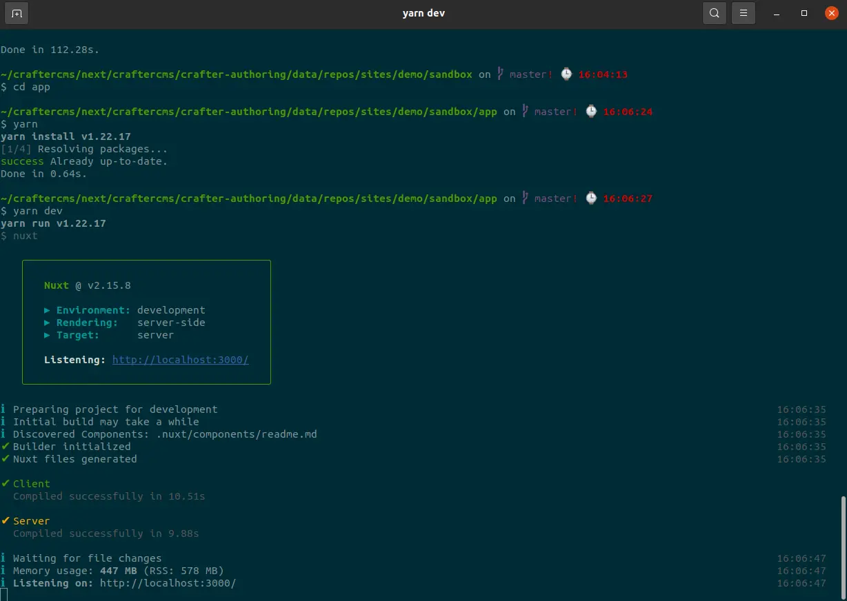 In the CrafterCMS site sandbox directory, you'll find a directory called app, which is the Nuxt.JS app. Visit that directory on your terminal and run `yarn`