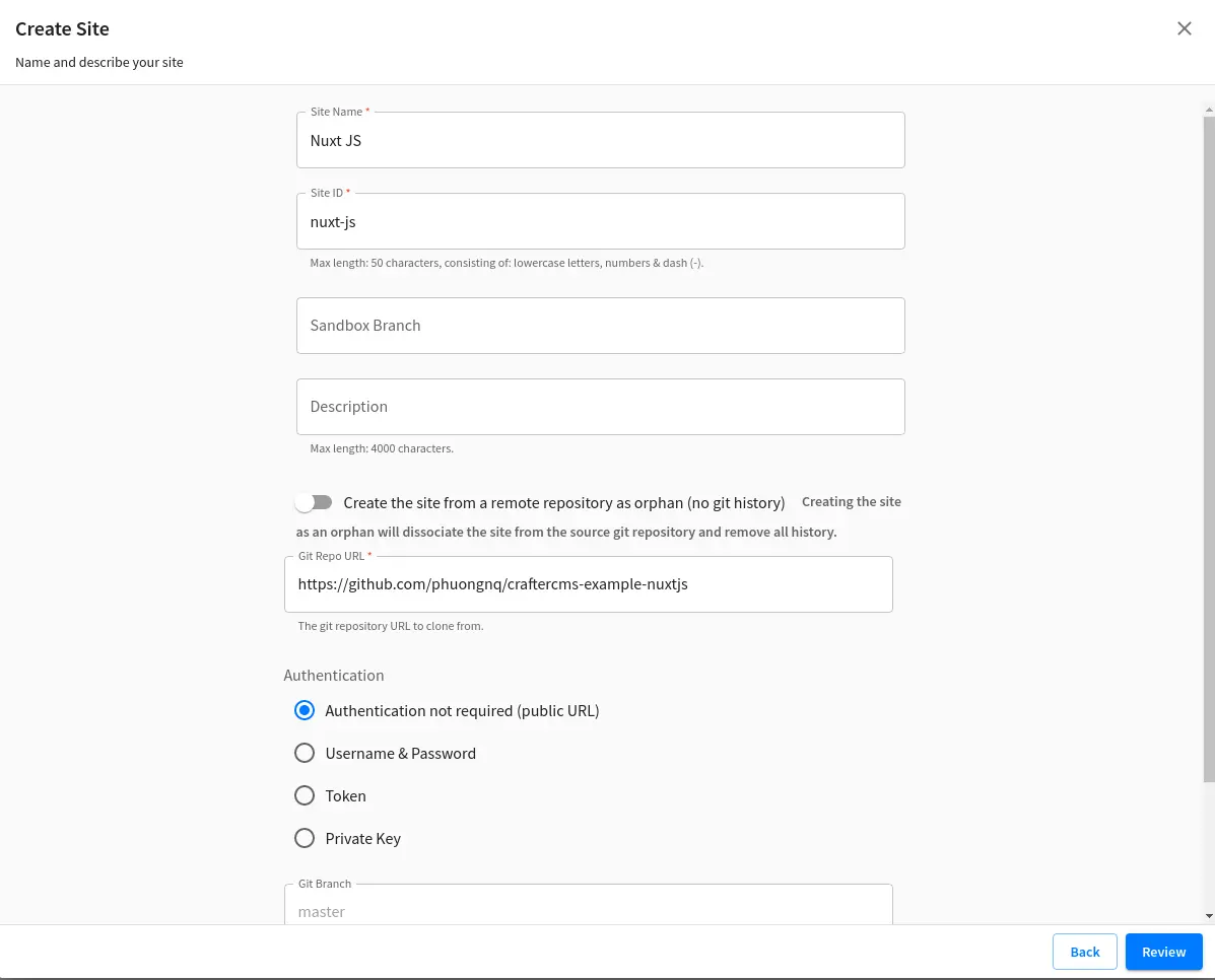 Input as follows and click Review > Create Site: