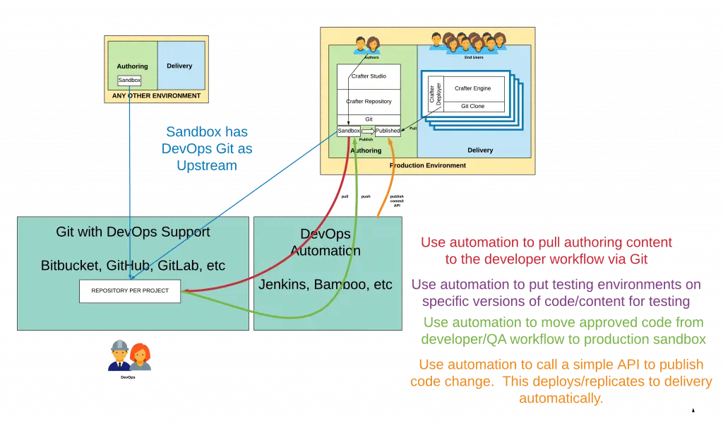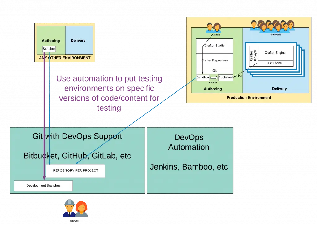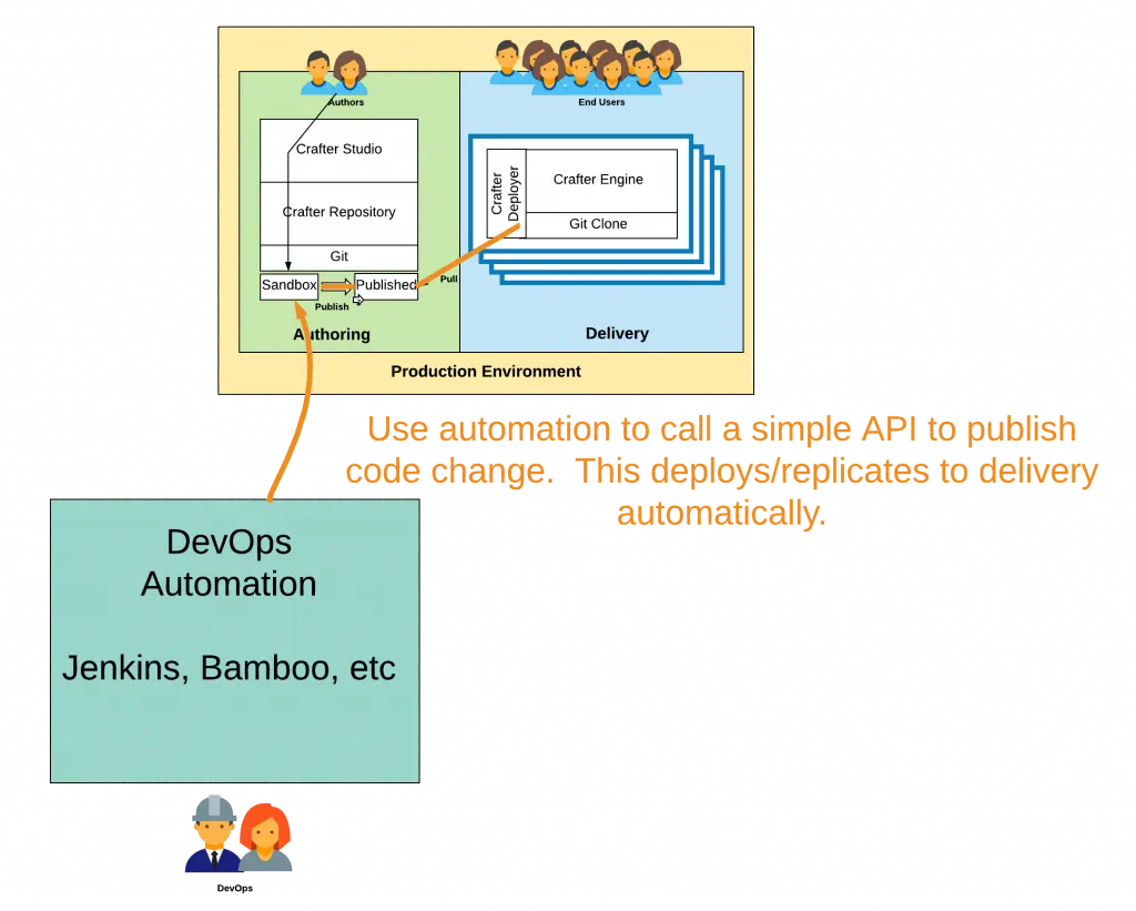 - Third: Because Crafter is Git-based you can natively support your ideal DevOps process for Continuous Integration and Delivery (CI/CD).