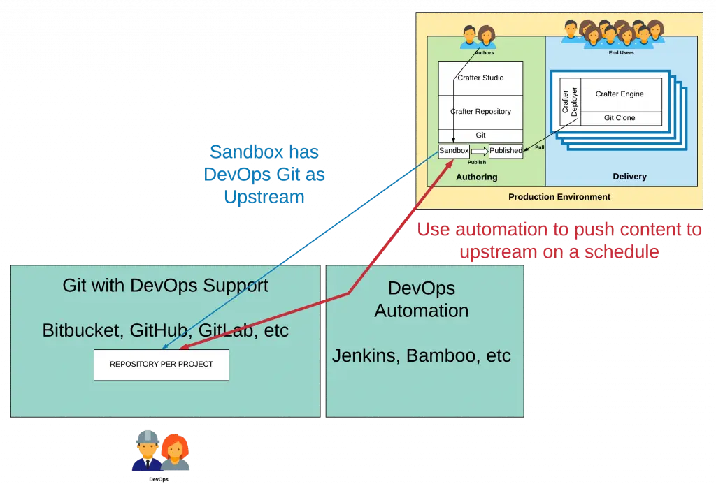 Figure 5: Content flows from Production Authoring Sandbox to the Developer repository via automated Git Push