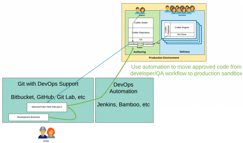 Figure 14: Full DevOps “Code Forward, Content Back” workflow for CI/CD with CrafterCMS leveraging Git mechanics and DevOps automation.