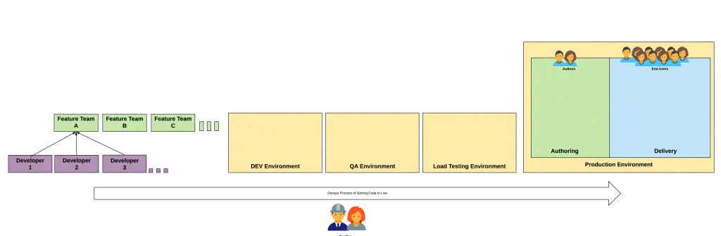 Figure 1: Production environment. Showing DevOps as part of the production workflow. DevOps do not want to touch production directly and should not have to. Unfortunately, most CMS platforms force them to do so.