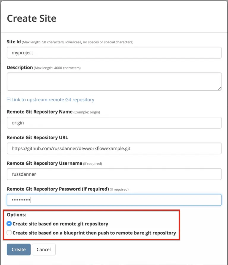 Clicking Create Site will present you with the Create Site dialog. This dialog changes depending on what you choose. Below is an example of the dialog filled out in a way that creates your project locally, set the Github repository as its upstream remote and pushes the initial project contents to the upstream repository.