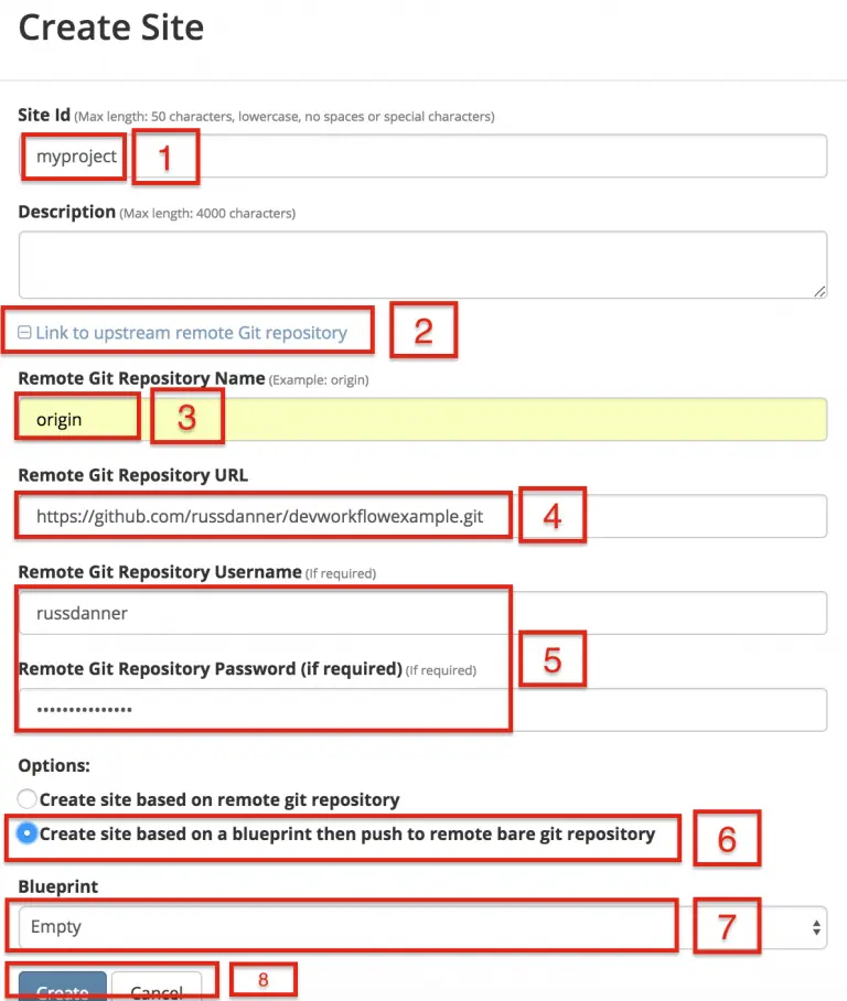 - Fill out the Create Site Form as in a similar fashion described in Step 2, except this time you chose the option to create your site based on an existing upstream repository. This can be your team’s branch or your own fork. The exact workflow is up to you.