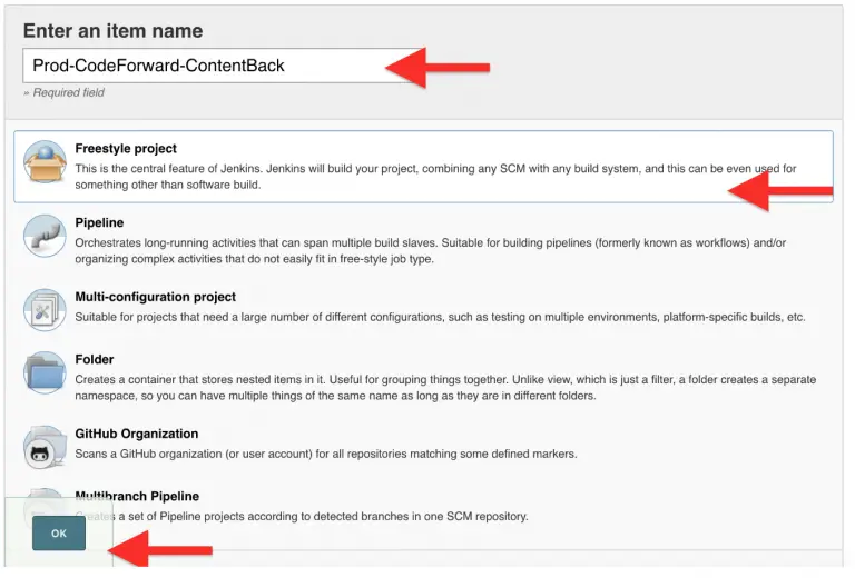 The first step is to create a project. Give the project a clear name and select the Freestyle project then click OK to continue.