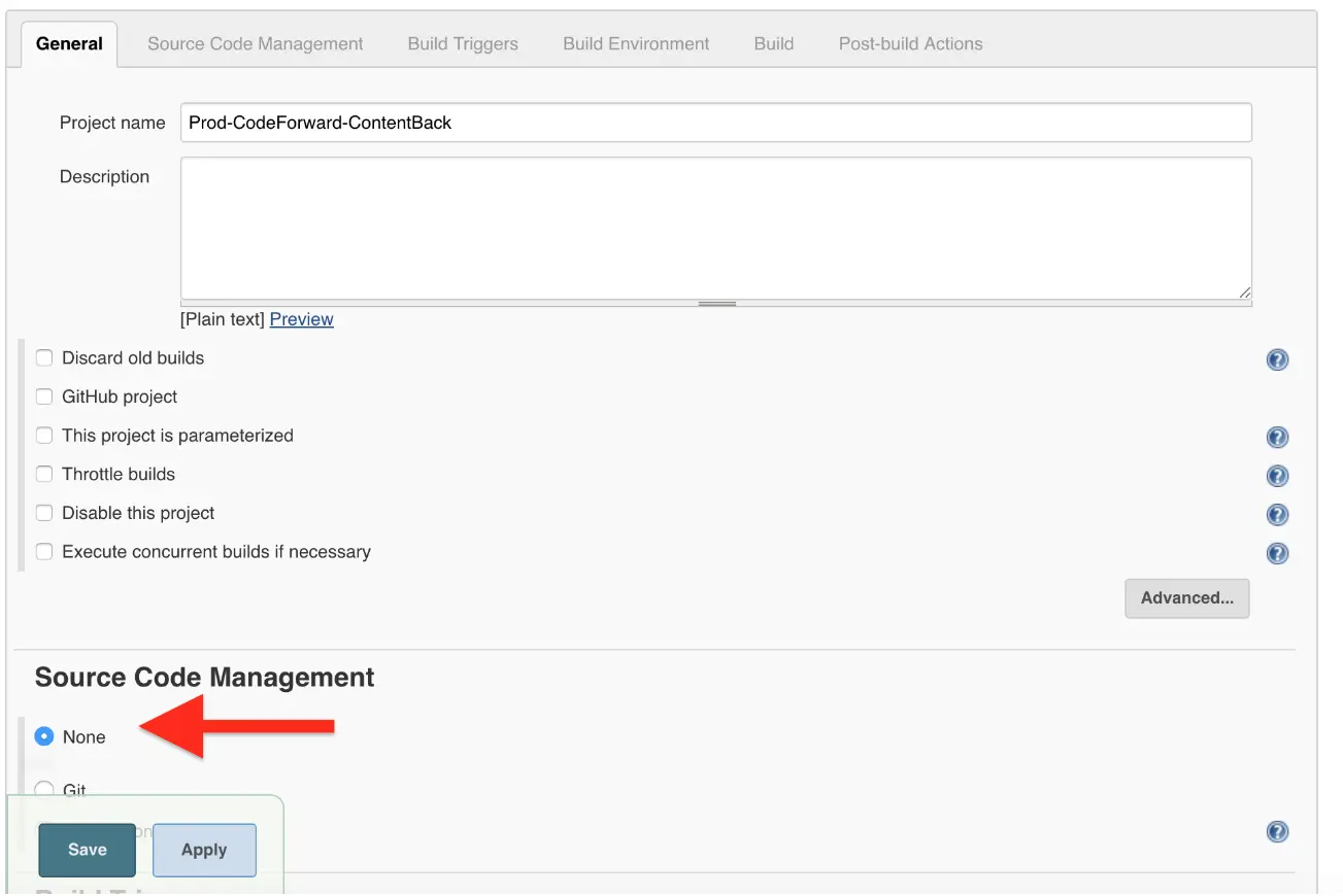 The next step is to define build triggers. Since you are calling APIs here and content back is most likely based on some schedule you define you want to indicate that there is no Source Code Management (SCM) aspect of the project.