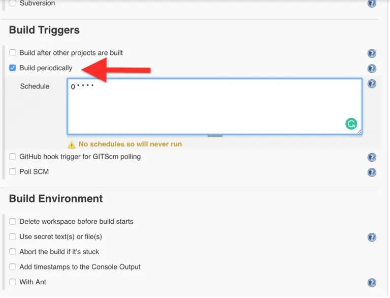 Select “Build Periodically” and define your schedule. Schedule definitions user standard Cron/Quartz configuration.