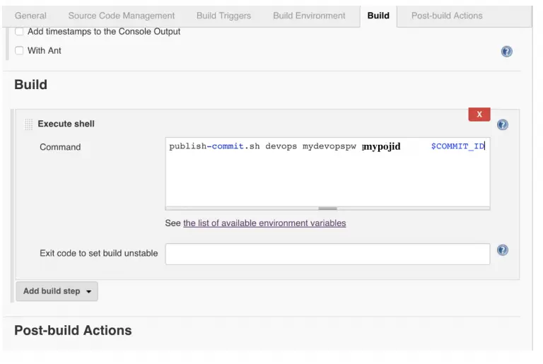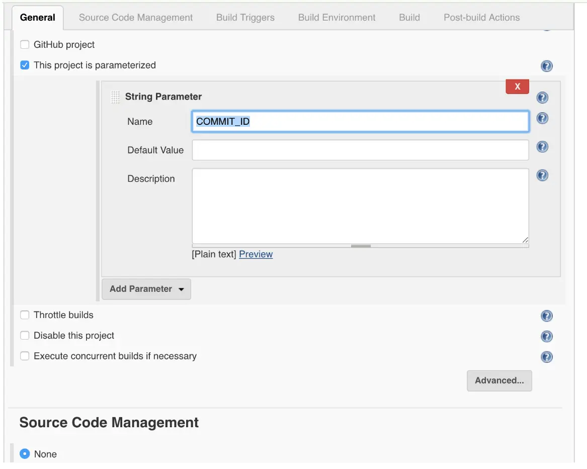 - You will ask the user for a parameter value COMMIT_ID via the UI on each invocation and pass that to the command line as the COMMIT_ID parameter value