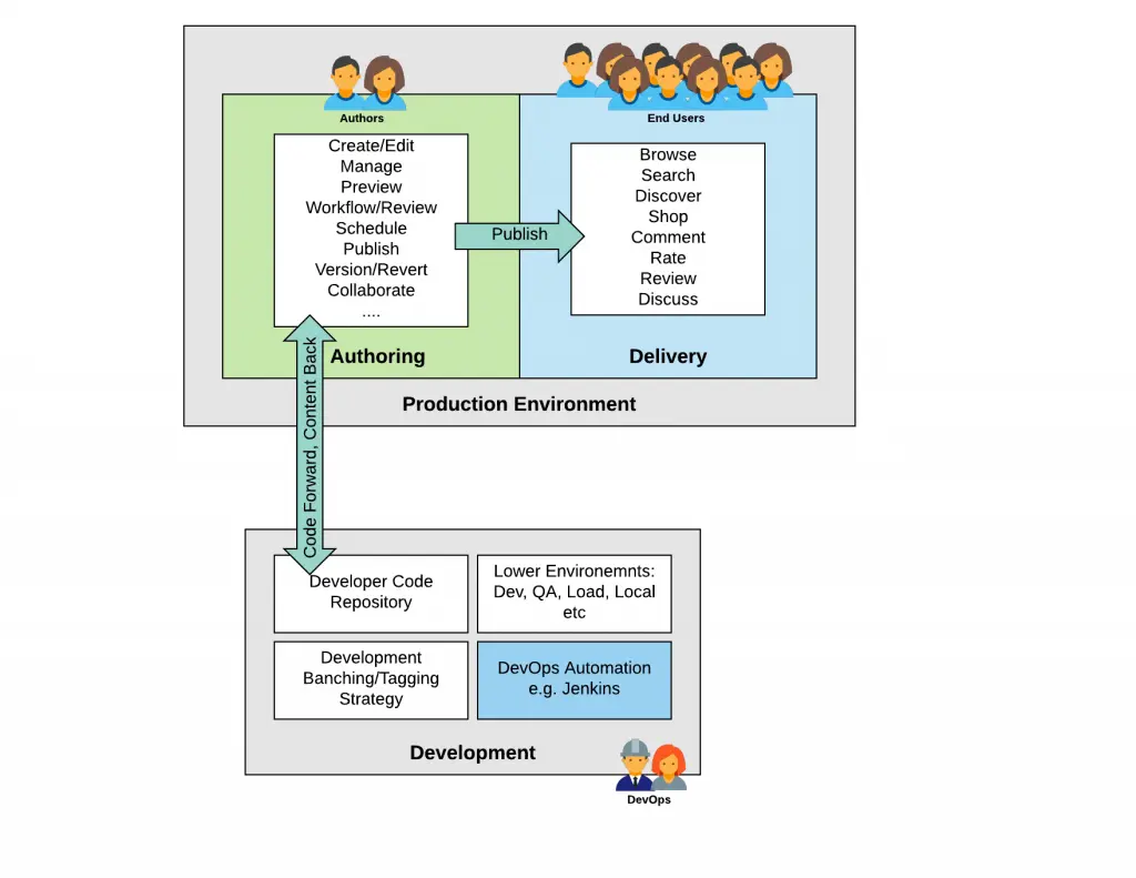 Both of these points in the process are illustrated and addressed in the diagram below by the double-headed arrow labeled Code Forward, Content back. With respect to the CMS, Code Forward, Content Back is the most important aspect of the DevOps automation.