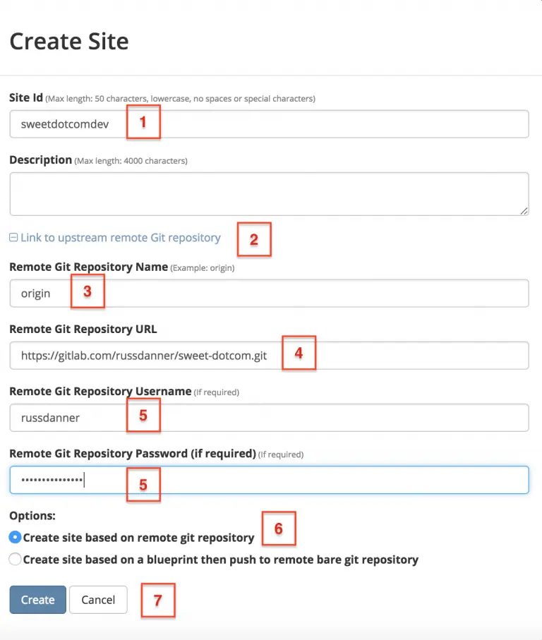 - In the “Remote Git Repository URL” field you must provide the link to the Git repository discussed in Step #1: https://gitlab.com/russdanner/sweet-dotcom.git