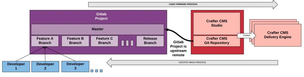 Many development teams use cloud hosted developer platforms like GitLab to assist with their development process. CrafterCMS’s Git based CMS supports developers working against remote repositories like GitLab, Github, Bitbucket, and others.