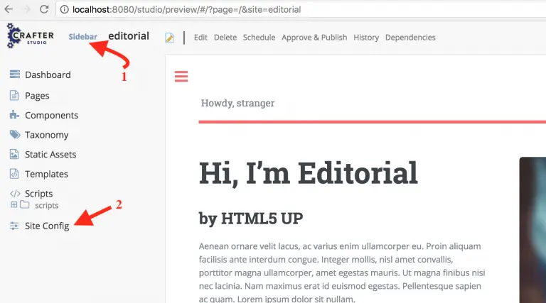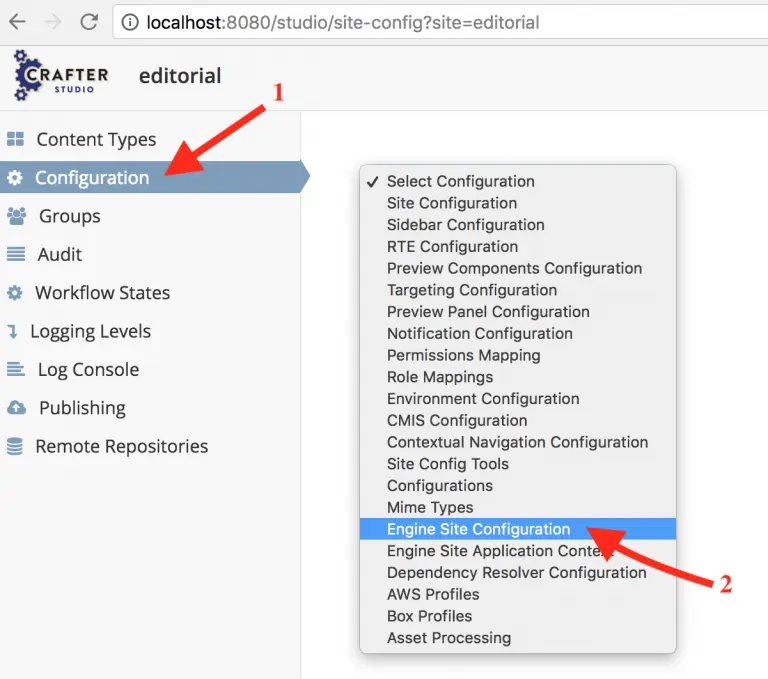 - In Crafter Studio, for your site/project, go to Site Config (found in the Sidebar)