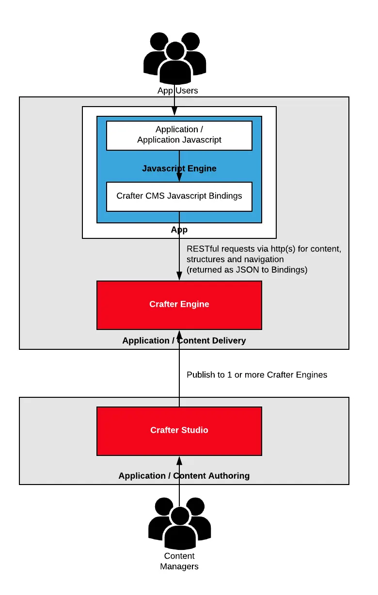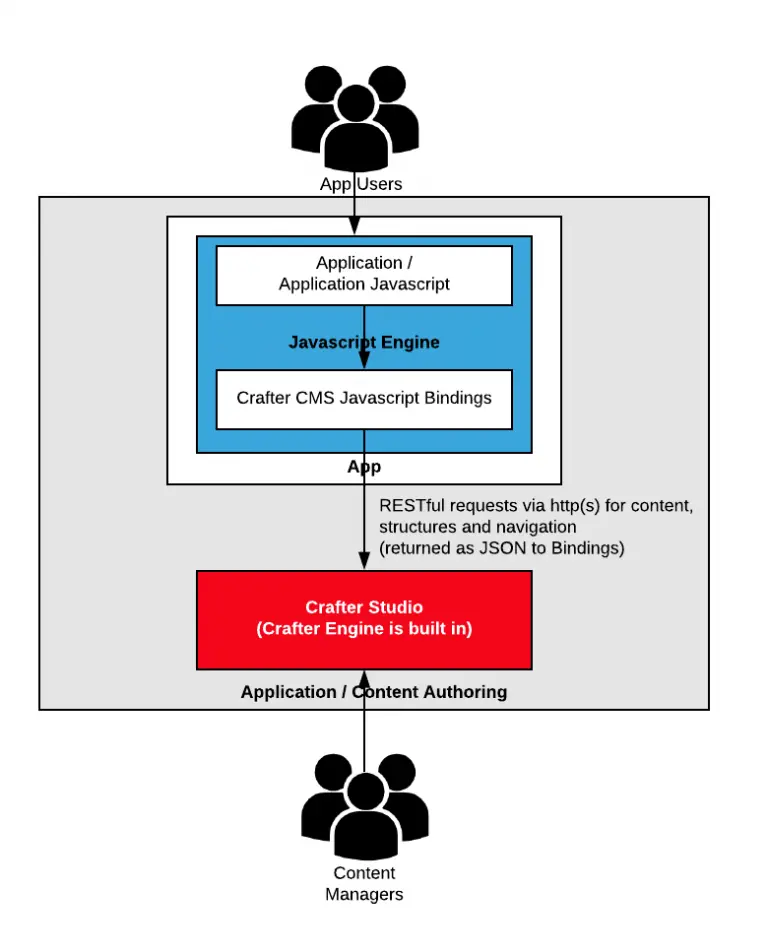 - The caller in this architecture is CrafterCMS’s Javascript bindings library which is making requests on behalf of the application.