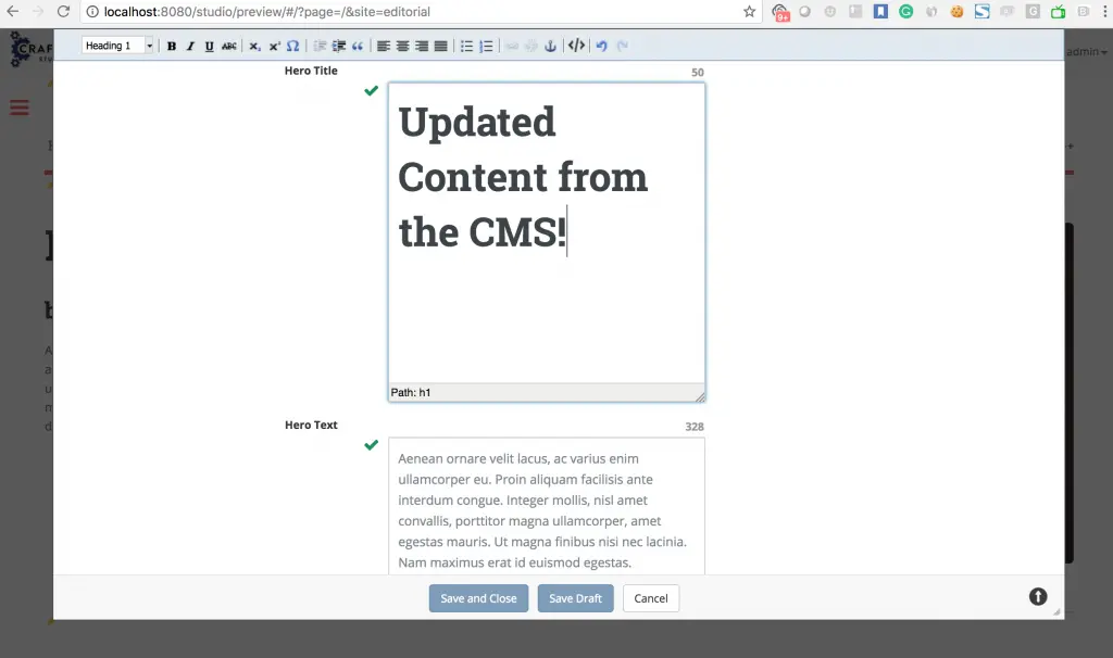 After you click the pencil for the Hero text make the change and then click the Save and Close button at the bottom of the form. You will see your update in the CMS right away.