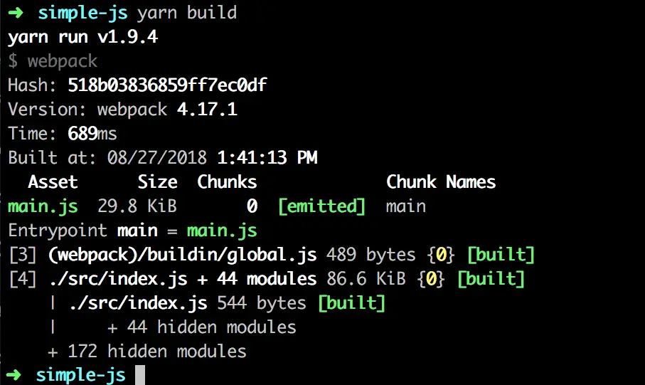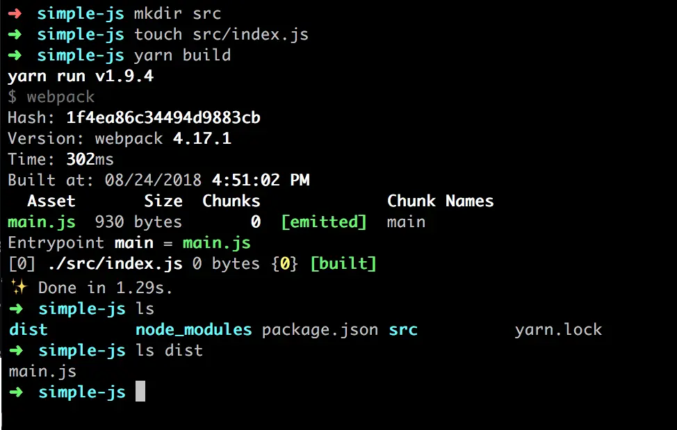 Once the file is in place you can run a yarn build command. This will create a dist folder with a compiled main.js. The main.js file contains a minified, concatenated set of your dependencies and your script.js code (which is currently empty.)