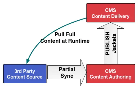 Approach 2 syncs a simple jacket for the content to the CMS but relies on runtime integration with the 3rd party system for the full details of the 3rd party content. The jacket in the CMS carries only the metadata required for the 3rd party content to participate in search, targeting and other dynamic behavior on the site. The “sync” that creates the jacket in the CMS may be done through a simple integration or can even be a manual process.