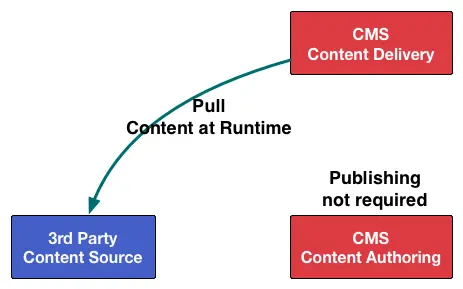- When it is impractical to import all of the 3rd party content in to the CMS. A typical use case for this approach is 3rd party hosted video. The CMS may contain only basic metadata and thumbnails while the 3rd party system retains all of the various video encodings.