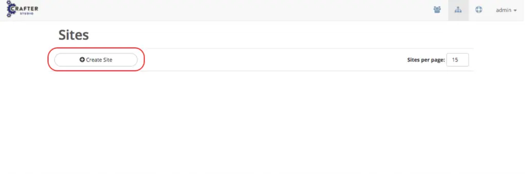 Next, you want to log in to Crafter Studio as the admin user. The admin user has the rights to create new projects (called sites.) Click Create Site.
