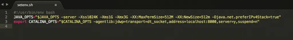 export CATALINA_OPTS="$CATALINA_OPTS -agentlib:jdwp=transport=dt_socket,address=localhost:8000,server=y,suspend=n"