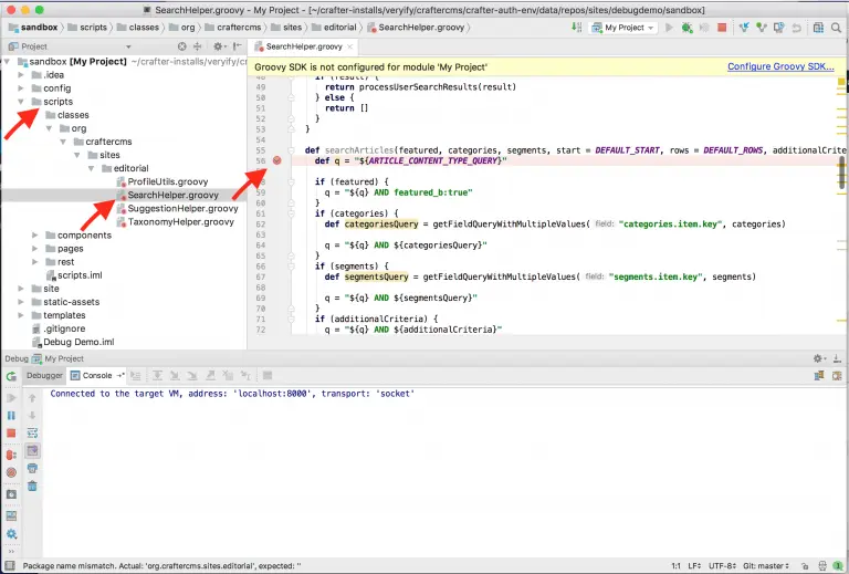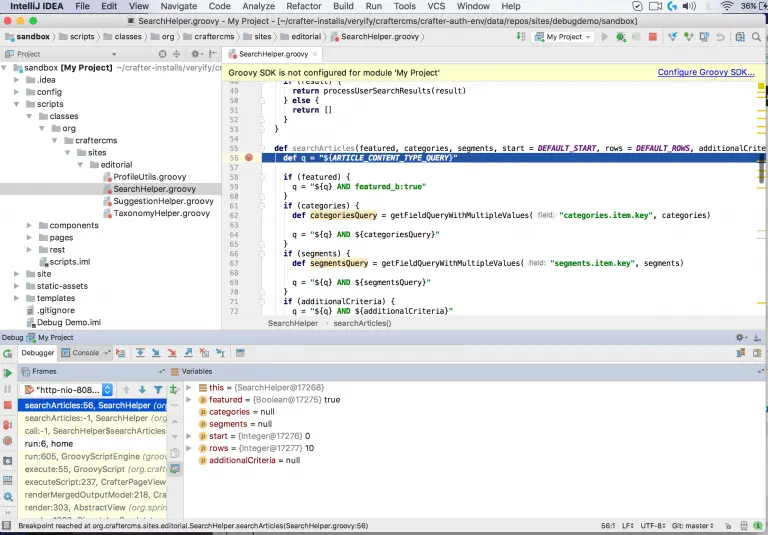 - Browse down through classes, org, craftercms, sites, editorial and open SearchHelper.groovy