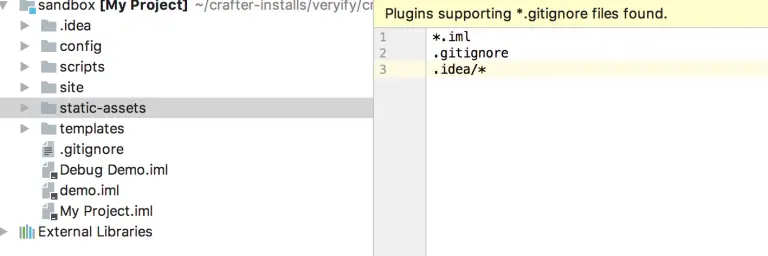 *.iml .gitignore .idea/* - This will tell Git and CrafterCMS to ignore your IDE project files